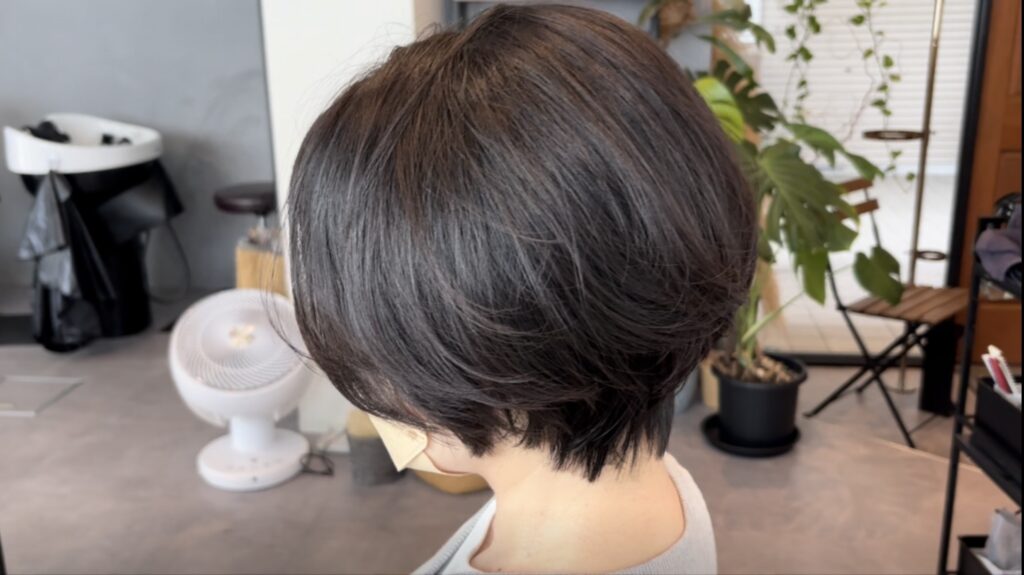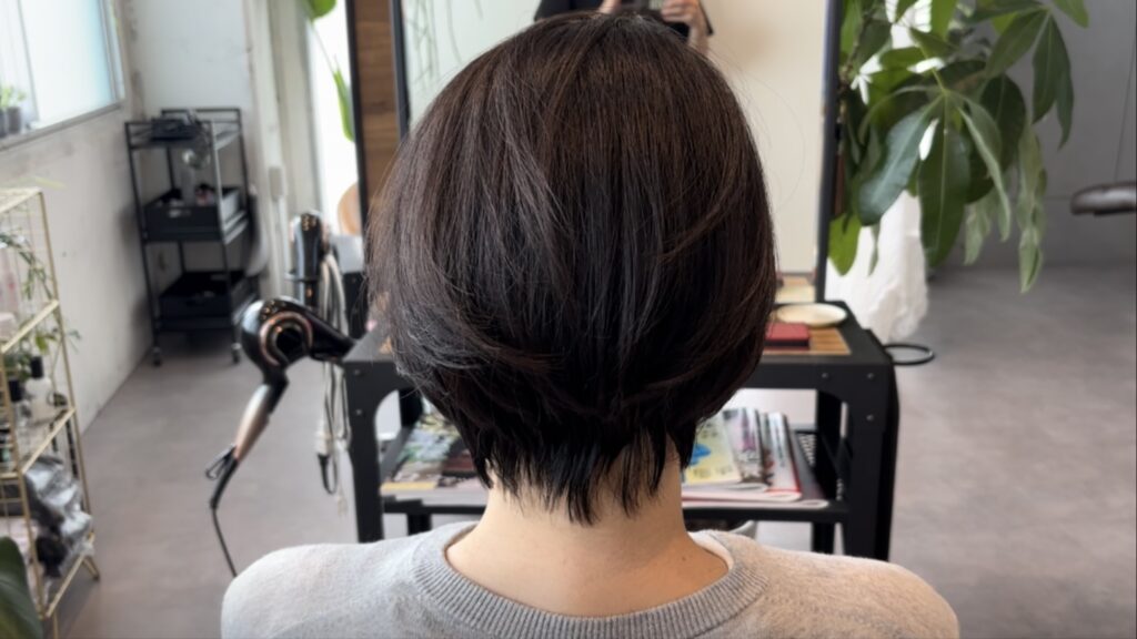 うねりを抑えたショートカット。癖とうねりを頭皮ほぐしシャンプーとおさまりカットで「垢抜けショートヘア」に。