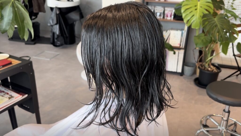 髪の質感、癖、うねりを見ながら、頭皮をほぐして、正しいヘッドポジションでキレイに丁寧にカットしていきます。