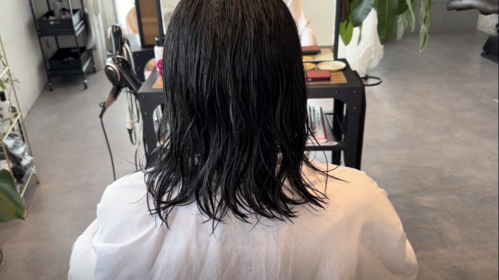 ・根元の生え癖をとるために、一度シャワーで濡らしてタオルでしっかり拭く